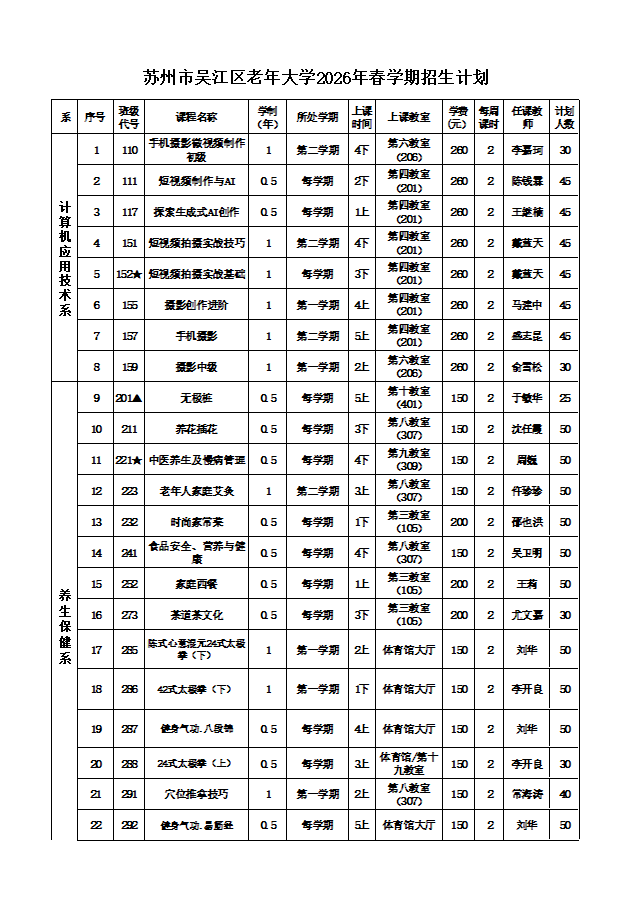 吴江区老年大学2026年春招生计划公示