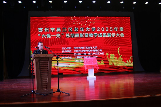 1128,在苏州青少年科技馆,区老年大学成功举办了2025年度“六优一先”总结表彰暨教学成果展示会。校长陈瑞荣讲话。农行苏州长三角一体化示范区分行副行长程静波致辞。