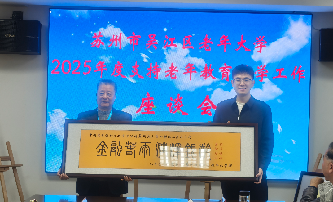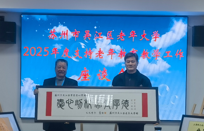 20251230日,在三楼会议室,吴江区老年大学召开了支持老年教育教学工作座谈会,并向吴江区常青爱心帮困会、苏州信息职业技术学院中国农业银行股份有限公司苏州长三角一体化示范区分行、上海银行苏州吴江支行等支教单位赠匾。